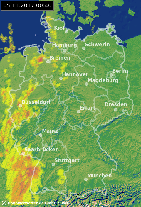 Das Radarbild zeigt aktuell schon einige Signale in der Westhälfte. Diese werden in den nächsten Stunden zahlreicher und intensiver werden. Sonst ist Der Himmel über Deutschland teils bewölkt, teils sternenklar. Gebietsweise haben sich Nebelfelder gebildet. Die Temperaturen liegen aktuell zwischen 1 Grad im Bayrischen-Wald und 14 Grad in NRW.