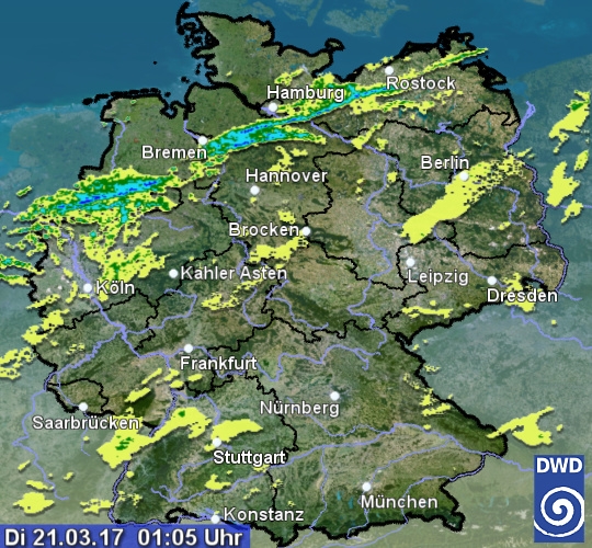 Das Radarbild zeigt das schmale Regenband der Kaltfront im Nordwesten mit teils kräftigen schauerartigen Regen. Diese Front wandert unter Aktivierung allmählich nach Südosten und wird etwa gegen Abend die Alpen erreichen. Dort bleibt sie stationär und sorgt für Dauerniederschläge, wobei die Schneefallgrenze wieder unterhalb von 1000 m sinken kann. Verbreitet fallen in Deutschland zwischen 2 und 10 Liter Niederschlag / m². In der Nacht auf Mittwoch und am Mittwoch sind im Alpenvorland zwischen 10 und 20 Liter Niederschlag / m² zu erwarten. Im Norden stellt sich Wetterberuhigung ein.