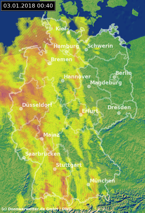 Heute und am Donnerstag fällt teilweise ergiebiger Regen, dazu drohen Sturm- und Orkanböen. In Verbindung mit dem Tauwetter bis ins höhere Bergland und Regenmengen an beiden Tagen zwischen 5 und 25 Liter pro Quadratmeter, regional auch noch mehr, drohen auch an größeren Flüssen einige Überflutungen. Dies gilt insbesondere für den Rhein und seine Nebenflüsse.