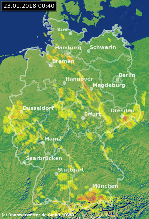 Das Radarbild zeigt aktuell noch einige leichte bis mäßige Signale mit Regen oder Sprühregen, im Osten unseres Landes fällt überwiegend noch Schnee. Sonst ist der Himmel über Deutschlands überwiegend wolkenverhangen, nur ganz vereinzelt zeigen sich die Sterne. Stellenweise haben sich Nebelfelder gebildet.