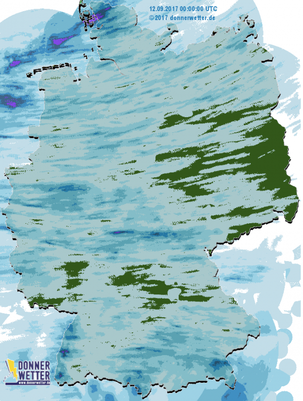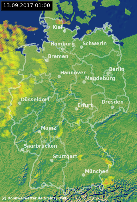 Das Radarbild zeigt aktuell nur noch wenige Schauersignale über Deutschland. Im Westen erkennt man aber schon die Niederschlagssignale des zur Nordsee ziehenden Sturmtiefs. Sonst ist der Himmel momentan in der Nordosthälfte von Deutschland häufig sternenklar, in der Südwesthälfte teils bewölkt, teils klar.