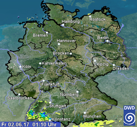 Das Radarbild zeigt aktuell hauptsächlich über dem Südschwarzwald und der Südwestalb noch Regensignale vorangegangener Gewitter, die jedoch allmählich schwächer werden. Sonst ist der Himmel über Deutschland oft sternenklar, oder nur leicht bewölkt. Im Norden hat sich stellenweise etwas Nebel gebildet.