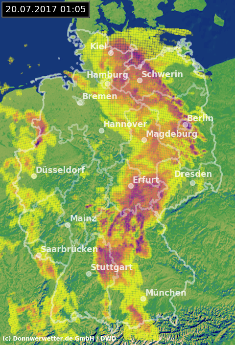 Das Radarbild zeigt aktuell eine von Nord nach Süd verlaufende Zone mit teils kräftigen Gewittergüssen, die mittlerweile auch schon Teile der östlichen Bundesländer erfasst hat. Über dem Westen hat sich eine sekundäre Schauerzone mit einzelnen Gewittern gebildet. In den nächsten Stunden können weitere Regensignale mit Blitz und Donner von Frankreich in den Südwesten herein ziehen.