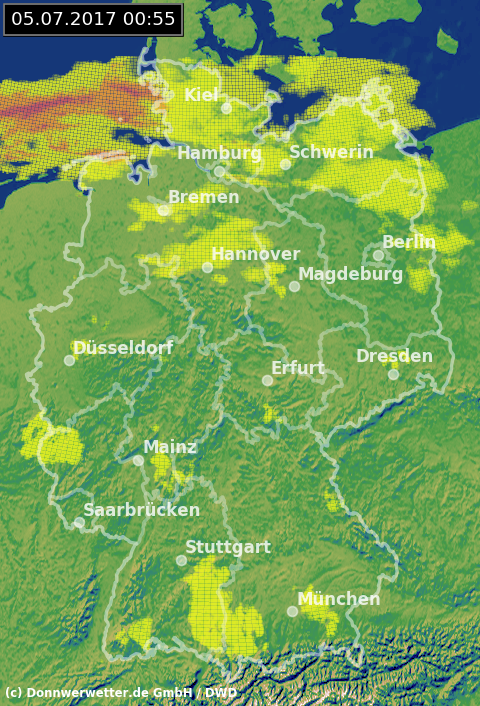 Das Radarbild zeigt von der Nordsee aufziehende Regensignale. Somit wird es im Norden in den nächsten Stunden gebietsweise regnen. Im Süden ist der Himmel oft sternenklar.