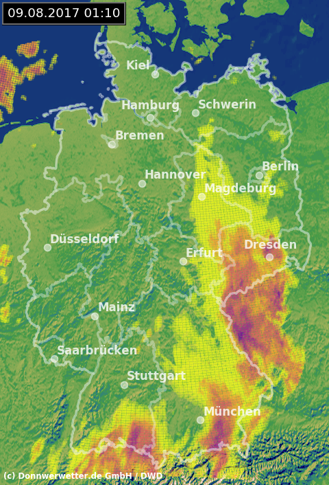 Heute bleibt es längere Zeit trocken. Im Laufe des Nachmittags entwickeln sich über Süddeutschland neue teils gewittrige Regengüsse, die sich bis zum Abend in die Mitte des Landes. Dabei muss erneut mit Mengen über 10 Liter pro Quadratmeter gerechnet werden.