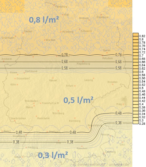 Am Dienstag fällt gebietsweise etwas Regen oder Sprühregen, im Bayrischen-Wald und in den Ostalpen kann es auch etwas schneien. Die Niederschlagsmengen liegen meistens unter 5 Liter pro Quadratmeter.