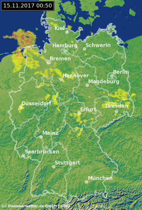 Das Radarbild zeigt aktuell in der Nordhälfte einige Niederschlagssignale. Hier fällt gebietsweise leichter Regen oder Sprühregen. Sonst ist der Himmel über Deutschland häufig bewölkt und nur teilweise aufgeklart. Stellenweise haben sich dichte Nebelfelder gebildet. Die Temperaturen liegen aktuell zwischen -3 und 8 Grad im Binnenland, sowie 11 Grad auf Helgoland. In Oberstdorf sind es dagegen über einer 5 cm hohen Schneedecke und sternenklaren Himmel eisige -10 Grad.