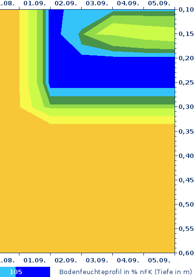 Der starke Regen zu Beginn des Monats hat die Böden in bis zu 30 cm Tiefe durchfeuchtet. Die wenigen Schauer der letzten Tage haben die Wasserbilanz der Böden dagegen nicht aufgewertet, da die Verdunstungsmengen die Regenmengen meist übertrafen.