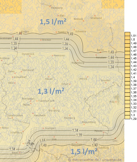 Bis Mittwoch überqueren uns von Südwesten, später von Westen weitere Regengebiete oder Schauerstaffeln, vereinzelt auch mit Blitz und Donner. Die täglich zu erwartenden Niederschlagsmengen liegen dabei in der Regel zwischen 5 und 20 Liter pro Quadratmeter. Gebietsweise bleibt es auch trocken.