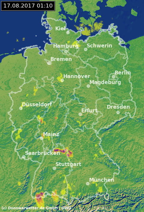 Das Radarbild zeigt aktuell einige Schauersignale, über dem nördlichen Baden-Württemberg und am Hochrhein auch kräftig und vereinzelt mit Blitz und Donner, langsam nordostziehend. Sonst ist der Himmel über Deutschland teils bewölkt, teils klar, stellenweise haben sich einige Nebelfelder gebildet.