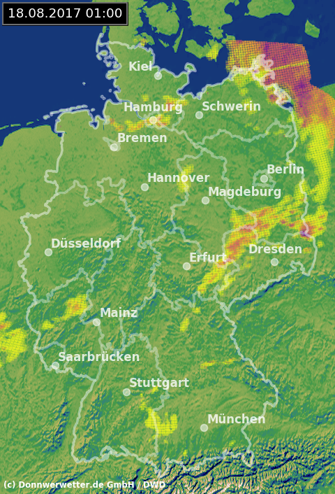 Das Radarbild zeigt aktuell allmählich nach Polen abziehende, aber gleichzeitig von Südwesten heranrückende neue Regensignale. Sonst ist der Himmel über Deutschland eher bewölkt und nur gebietsweise aufgeklart.