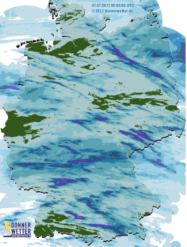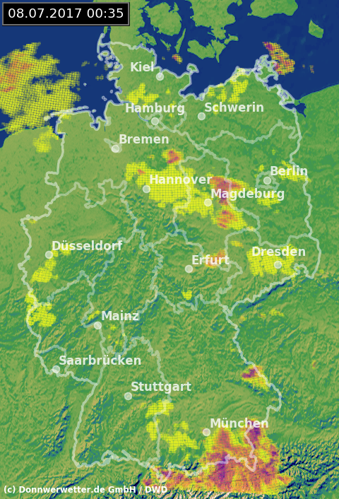 Das Radarbild zeigt aktuell über Sachsen-Anhalt, sowie Südostbayern noch einige kräftigere Schauer- bzw. Gewittersignale, die langsam nach Südosten ziehen. Sonst ist der Himmel teils bewölkt, teils sternenklar.