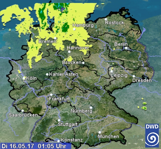 Das Radarbild zeigt aktuell im Norden leichte Warmfrontregensignale an. Leichter Regen fällt aber momentan nur im westlichen Schleswig-Holstein, auf Helgoland und Sylt.