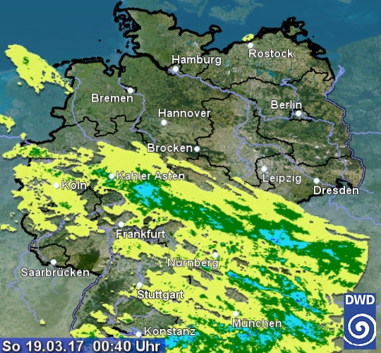 Das Radarbild zeigt über der Mitte und im Süden ausgeprägte Signale von leichtem bis mäßigem Regen, oder Sprühregen. Im Nordosten des Landes ist der Himmel überwiegend klar. Hier können die Temperaturen örtlich in den leichten Frostbereich sinken. Bis zum Mittag verlagert sich das Niederschlagsgebiet nach Nordosten. Anfangs können sich in der kälteren Luft auch Schneeflocken unter die Tropfen mischen. Im Südwesten lässt der Regen nach und vereinzelt stellen sich kurze Auflockerungen ein. Es können verbreitet zwischen 2 und 15 Liter Niederschlag / m² fallen, örtlich auch mehr.
