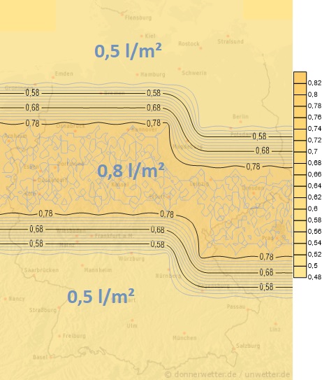 Am Sonntag überquert uns das Regengebiet allmählich von West nach Ost. Dabei können gebietsweise zwischen 10 und 20 Liter pro Quadratmeter fallen.