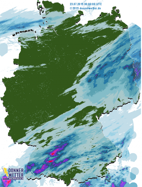 Die 24 Stunden Regenkarte vom Donnerstag zeigt die Schauerwolken über Süd- und Ostdeutschland. Im Nordwesten war es dagegen weitgehend trocken: