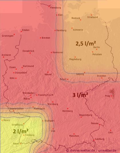 Bis zum Abend klangen die meisten Schauer dann ab und es kam hauptsächlich nur noch entlang der Alpen zu weiteren Regenfällen. In vielen Regionen des Landes, wie beispielsweise im Nordosten oder im Ems- und Rheinland, blieb es hingegen durchweg trocken.