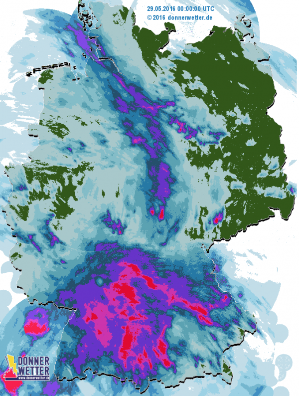 Diese zogen vom Alpenrand Richtung Norden und erreichten in der Nacht auch die Mitte Deutschlands. Dabei kam es in weiten Teilen Bayerns und Baden-Württembergs zu heftigen Gewittern mit Starkregen und infolge dessen auch zu Überschwemmungen. In vielen Regionen vom Alpenrand bis an den Main kamen in wenigen Stunden mehr als 50 Millimeter Niederschlag pro Quadratmeter zusammen.
