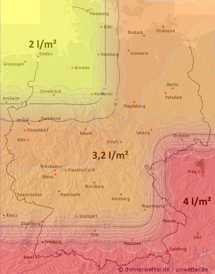 Südlich einer Linie Frankfurt am Main - Bayreuth blieb es hingegen vielerorts vollständig trocken. Lediglich im äußersten Südosten vom Bayrischen Wald bis ins Berchtesgadener Land fielen ebenfalls ein paar Tropfen.
