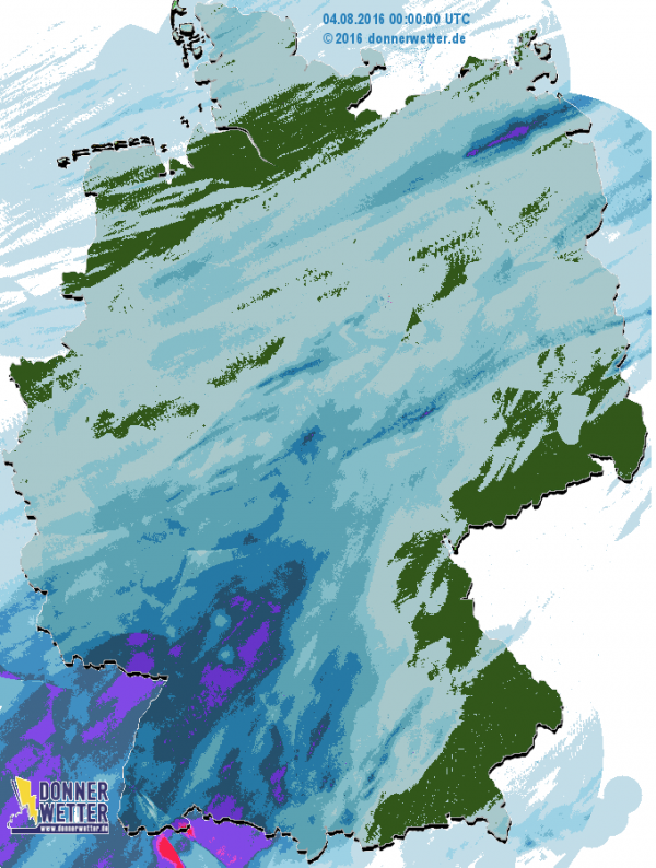 Nachdem in der Nacht zu Donnerstag die meisten Schauer der vergangenen Tage abgeklungen waren, zog bereits am Morgen ein neues Regenband von Westen her auf die Bundesrepublik zu und erreichte in den Morgenstunden die Pfalz und die Eifel.