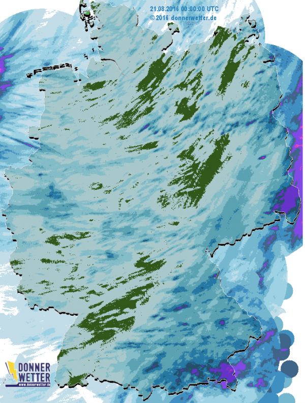 In der Nacht von Samstag zu Sonntag regnete es zunächst vor allem noch in der Osthälfte, dieses Regenband zog jedoch bereits in den frühen Morgenstunden weiter gen Polen und Tschechien.