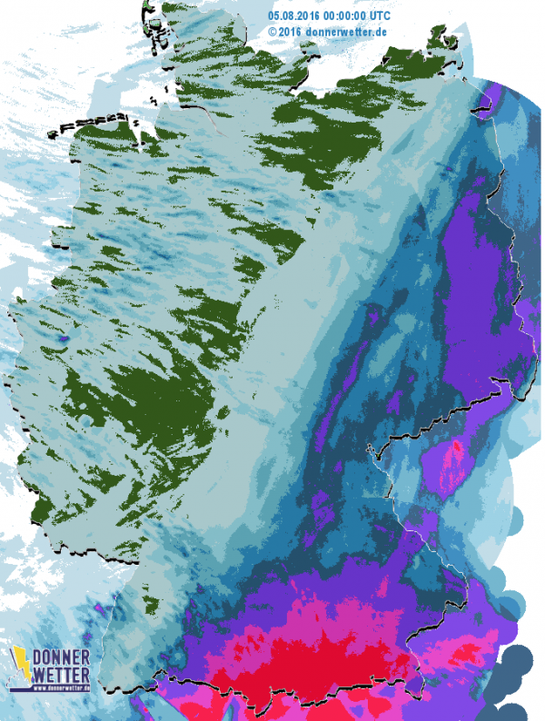 Das dichte Regenband, das bereits am Donnerstag von Westen her nach Deutschland gezogen war, hielt auch in der Nacht zu Freitag seine Stellung über der Süd- und Osthälfte der Republik. Zwar zogen die Niederschläge im Tagesverlauf langsam ostwärts, insbesondere zwischen Allgäu und Berchtesgadener Land hielten die Regenfälle jedoch bis zum späten Abend ohne Unterbrechung an. Dadurch fielen entlang der Alpen verbreitet 50 bis 80 Liter Regen pro Quadratmeter. Auch sonst kamen zwischen Bodensee und deutsch-polnischer Grenze verbreitet bis zu 50 Liter Regen zusammen.