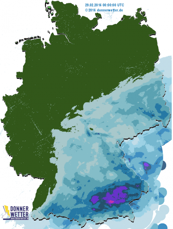 Gestern gab es bis zu 40 l/m2 an Niederschlag im Südosten des Landes. Besonders Bayern war nass. Heute morgen gibt es verbreitet eine Schneedecke in Thüringen, Sachsen und Bayern. Nur noch wenig Schnee fällt hier heute.