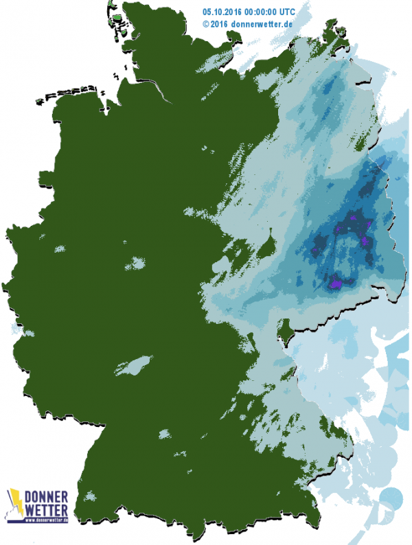 In den Morgenstunden regnete es schon zwischen Ostsee und Erzgebirge vereinzelt, in der zweiten Tageshälfte zog dann von Osten ein weiteres, ausgeprägtes Regenband auf und brachte zwischen Ostsee und Bayerischem Wald weiteren Regen. Auch in der Nacht zu Donnerstag klangen die Schauer vielerorts nicht ab.