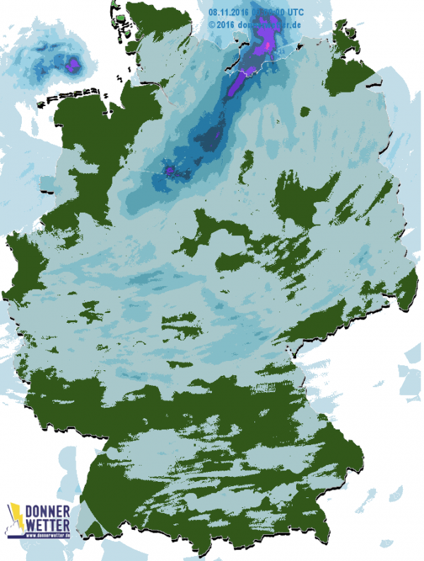 Über Deutschland brachte gestern das abziehende Tief "Husch" nochmals Regen und Schnee. In Hamburg fielen mehrere Zentimeter Neuschnee. Vielfach war es auch Schneeregen in NRW und Niedersachsen und Berlin. Aktuell steht die Nässe auf den Straßen und überfriert. Ein neues Tief nähert sich von Westen her mit Regen zum Nachmittag.