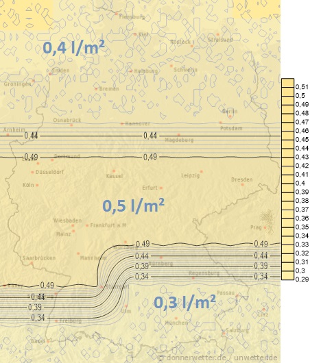 Heute überquert uns eine etwas intensivere Front mit Niederschlägen. Bei leichter Milderung fällt teils Regen, teils Schnee. Die Mengen liegen dabei meist zwischen 1 und 10 Liter pro Quadratmeter.