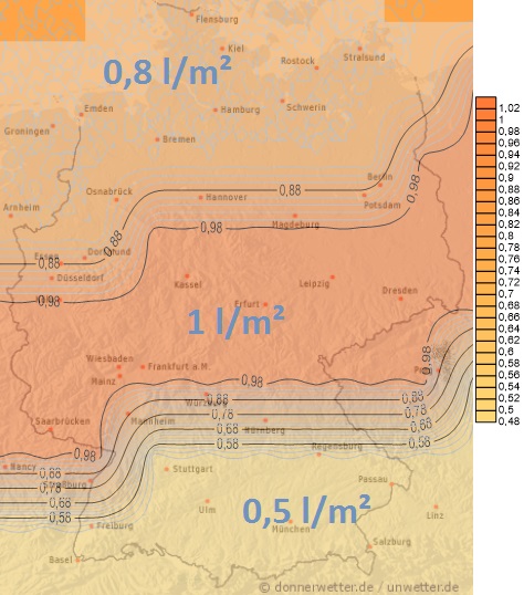 Heute ziehen von Westen wieder Regengüsse mit örtlichen Gewittern übers Land. Die Niederschlagsmengen bleiben meist unterhalb von 10 Liter pro Quadratmeter.