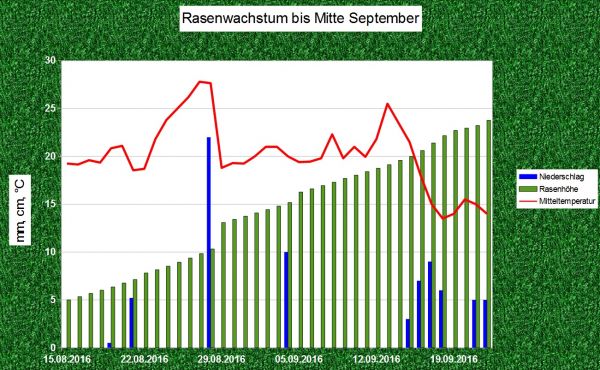 Angenommen der letzte Schnitt erfolgte am 15. August diesen Jahres, also vor 4 Wochen, dann ist die Wiese seitdem wieder um durchschnittlich 14 cm gewachsen. Vor allem die hohen Niederschlagsmengen am letzten Augustwochenende haben dem Grünland einen regelrechten Wachstumsschub verliehen.