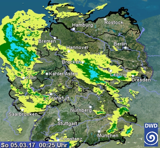 Das Radarbild zeigt uns momentan Regenechos im Westen und über Thüringen. Diese kommen langsam Richtung Norden, beziehungsweise Nordosten voran. Sonst fällt nur gebietsweise etwas Regen oder es treten einzelne Schauer auf.