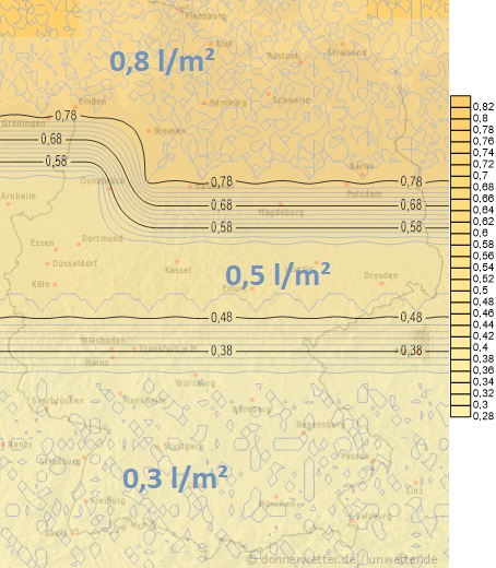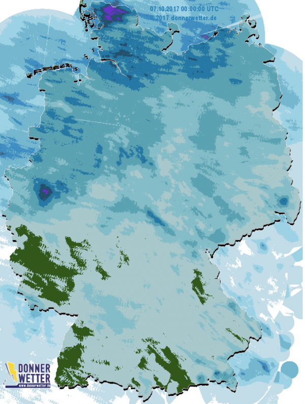 Heute fällt verbreitet noch Regen oder es gehen Schauer nieder. Dabei können teilweise zwischen 10 und 20 Liter Regen pro Quadratmeter fallen, örtlich auch mehr. Nur im Nordwesten, sowie in Schleswig-Holstein treten Schauer selten auf.