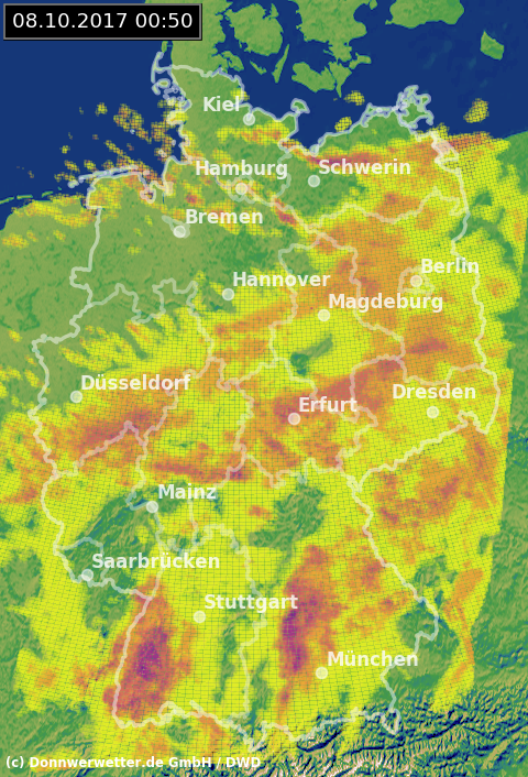 Das Radarbild zeigt aktuell recht verbreitet Niederschlagssignale, die von Nordwest nach Südost über Deutschland hinweg ziehen. Sonst ist der Himmel über Deutschland überwiegend wolkenverhangen und nur selten aufgelockert.