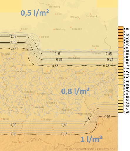 Heute zieht von Frankreich weiterer Niederschlagszone diagonal über unser Land hinweg. Gebietsweise können dabei zwischen 10 und 25 Liter pro Quadratmeter fallen. Da die Temperaturen spürbar zurückgehen, kann der Regen in der Südhälfte zum Abend in Lagen oberhalb von 300 bis 500 m in Schnee übergehen. Nur im Nordwesten bleibt es abgesehen einzelner Schauer trocken.