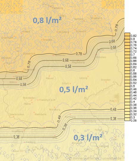 Heute fällt im Süden noch längere Zeit Niederschlag, teils als Regen, teils als Schnee. Sonst ziehen neben kurzen sonnigen Abschnitten auch einige Schauer übers Land. Im Bergland fallen die Schauer als Schnee, sonst als Regen, oder mit Graupeln vermischt. Die Niederschlagsmengen liegen aber allgemein unter 15 Liter pro Quadratmeter.