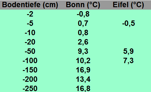 Die folgende Tabelle zeigt die heutigen Erdbodentemperaturen (08:00 Uhr) an unseren Messstationen in Bonn und Hellenthal (690 m Höhe) in Tiefen zwischen -2 und -250 cm.
