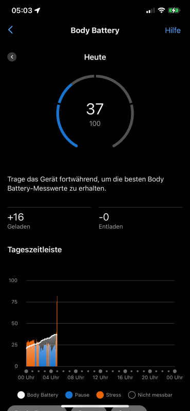 Die vor dem Lauf nahezu komplett gefüllten Energiereserven wurden bis zum Ende um etwa 90 Prozent aufgebraucht; selbst mit der Regeneration ab den späten Abendstunden stand der Körper noch immer unter Stress (rote Linien).