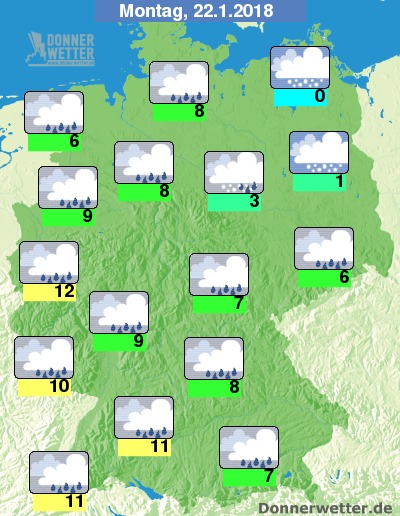 Die Kaltphase vom Wochenende ist im Westen und Südwesten Deutschlands dagegen schon sprichwörtlich Schnee von gestern. Bei bedecktem Himmel und zeitweiligem Regen steigt das Quecksilber hier auf fast schon frühlingshafte um 10 bis 12 Grad C.