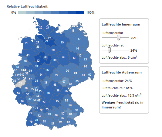 Die Luftfeuchteberechnung für Ihren Wohnort finden Sie hier, bzw. in der Navigation unter "Gesundheit --> Biowetter".