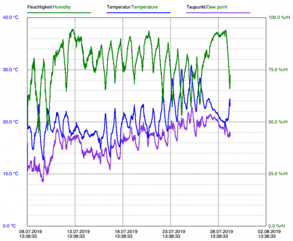 Messungen im Hitze-Juli 2019 zeigen, inwieweit Efeu tatsächlich als natürliche Dämmung geeignet ist: Während die Temperatur am 25. Juli 2019 an der Fassade unter dem Efeu gerade einmal knapp die 30-Grad-Marke überschreitet, messen wir knapp 42,1 Grad Celsius Lufttemperatur. Unter dem Efeu ist es demnach knapp zehn Grad kühler, als in der Umgebung.