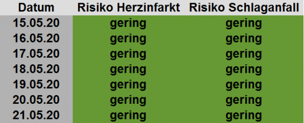 Das warme und ruhige Hochdruckwetter sorgt am Wochenende und in der neuen Woche nur selten für erhöhte Belastungen. Besonders Temperaturen zwischen 23 bis 27 Grad C sorgen bei Schlaganfall- und Herzinfarkt- Risikogruppen für Normalität.