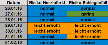 Leicht erhöhte Schlaganfall- und Herzinfarktrisiken sind erst wieder zum kommenden Wochenende zu erwarten.