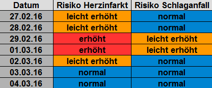 Seit Jahren ist bekannt, dass atmosphärische Veränderungen zu einer Häufung von Schlaganfällen und Herzinfarkten führen können. Insbesondere bei schnellen Änderungen von Temperaturen kommt es einem Anstieg von Fällen bei Risikopatienten. Besonders Menschen mit Vorerkrankungen sind betroffen. Das Wetter ist allerdings nicht die Ursache des Herz- Kreislaufproblems, sondern Vorschädigen zusammen mit Wetterstress führen zum akuten Auslösen des Herzinfarktes oder Schlaganfalles.