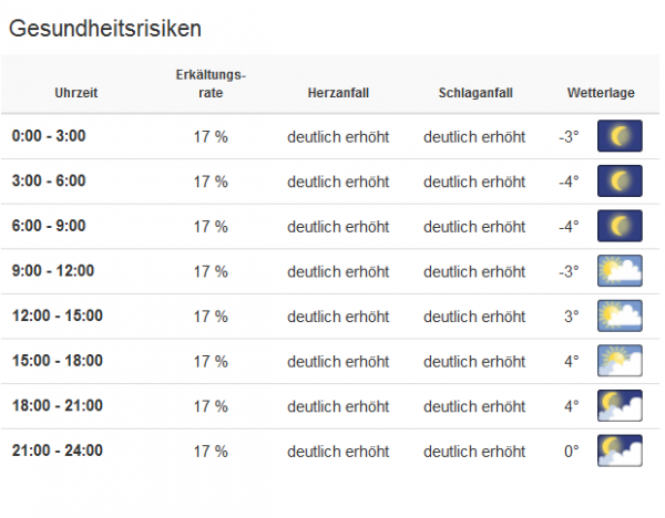 Noch sind die Risiken für Herzinfarkt und Schlaganfall erhöht. Durch die steigenden Temperaturen in der nächsten Woche sinken die Risiken deutlich. Mehr im lokalen Herz-Kreislauf-Wetter: