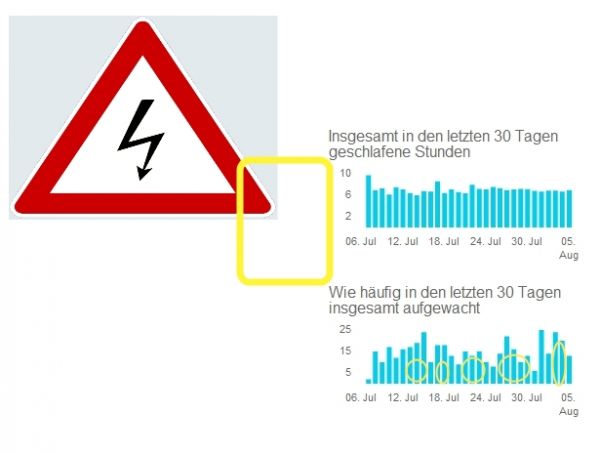 Während der Gewitter und der großen Schwüle wachen wir wesentlich häufiger auf; obwohl sich die Anzahl der geschlafenen Stunden nur wenig reduziert, sind wir dadurch weniger erholt.