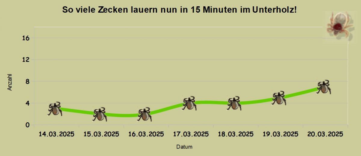 In 15 Minuten lassen sich in den milden Regionen des Landes bis Mitte nächster Woche nun bereits bis zu sieben Zecken im Unterholz finden.