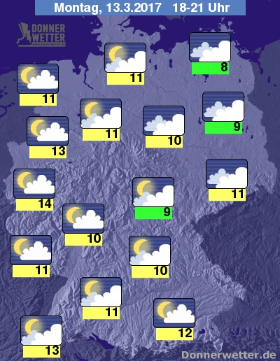 Heute Nachmittag halten sich über dem Nordosten Deutschlands meist dichte Wolken aus denen jedoch kein Regen fällt. Den längsten Sonnenschein bekommt der Süden ab, hier ist es verbreitet nur sonnig, aber auch in den übrigen Landesteilen ist bei meist nur leichter bis lockere Bewölkung viel Sonne möglich, dabei bleibt es trocken. Die Temperatur liegt bei 8 Grad an der Müritz und etwa 13 Grad im Rheinland.