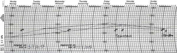 Nach dem langen Anstieg des Luftdrucks in der letzten Woche, stoppte der Anstieg mit einem Trendbruch am Samstag. Zum Sonntag hin wurde ein neuer Trendbruch mit einem neuen Anstieg begründet - das Hochdruckwetter setzt sich in dieser Woche nochmals fort.